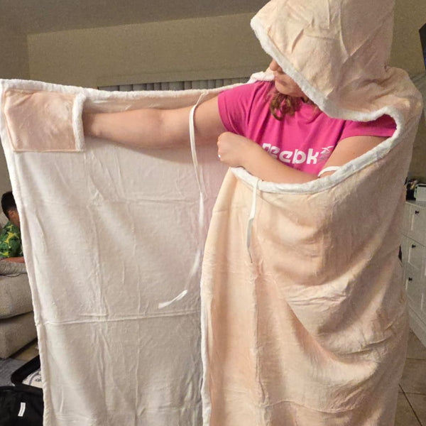 I love this blanket!. It has a big hood, two roomy front pockets, and even a snap button to keep it closed
